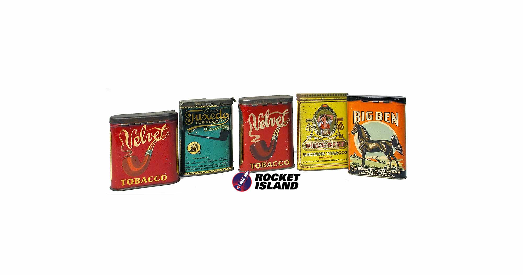 Digital image download of Tobacco Tins (1920s and 1930s), including Velvet, Tuxedo, Dill’s Best and Big Ben tobaccos. American.